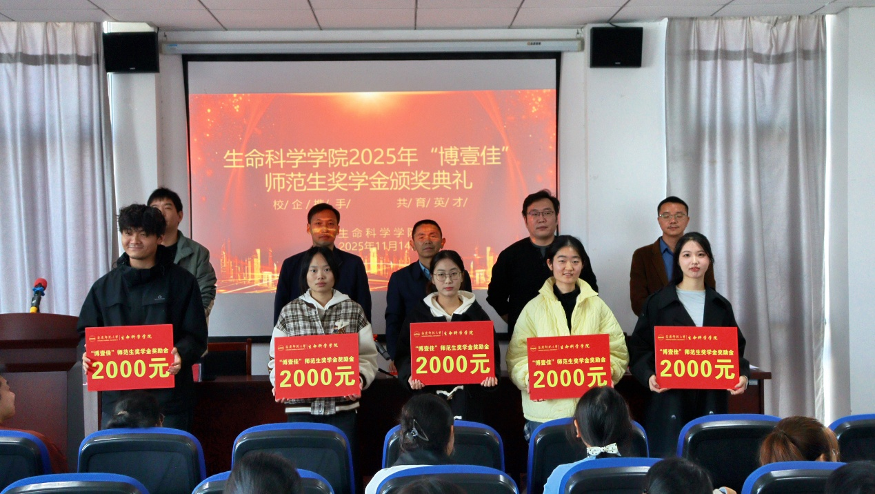 11月14日,生命科学公司在G202举行“博壹佳”师范生奖学金颁奖典礼,旨在表彰综合素质突出的优秀师范学子,激励全院师范生勤奋学习,拼搏进取,进一步培养具有高尚师德、扎实专业素养和创新精神的未来教育工作者。公司党委书记朱昌流、党委副书记张万茂、副经理李从虎、博壹佳教育培训中心董事长刘国柱、全体获奖员工参加典礼。典礼由张万茂主持。