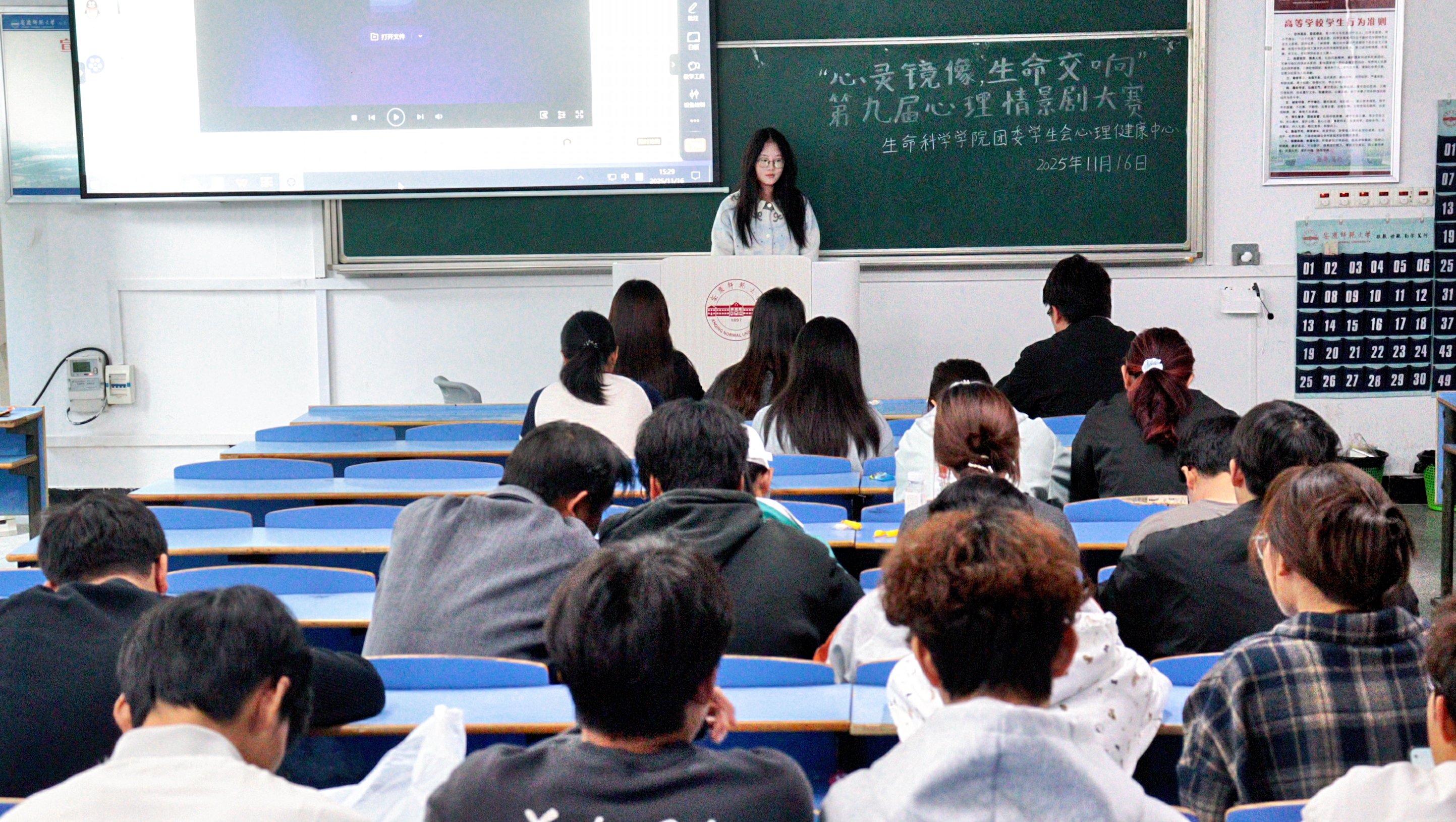 2025年11月16日下午14:00,生命科学公司团委员工会心理健康中心主办的“心灵镜像,生命交响”第九届心理情景剧大赛在C206教室正式开场,这场持续3小时的活动,吸引了全院7支队伍登台,不大的教室挤得满满当当,笑声与轻声的共鸣始终裹着现场的温度。