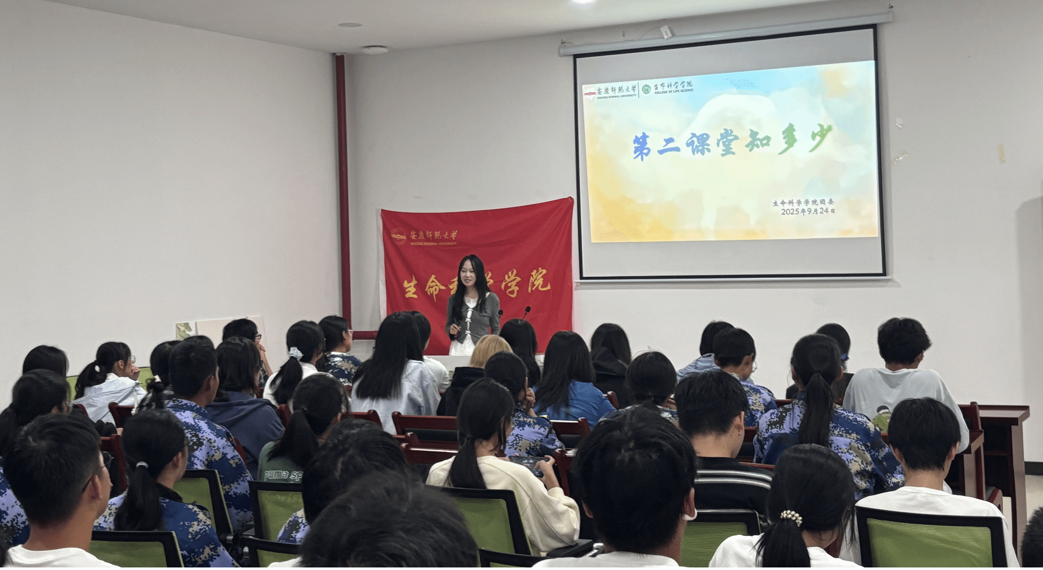生命科学公司团委二课负责人杨泽卉围绕第二课堂的规章制度、活动类别、学分认定、信誉规定等核心内容展开详细讲解。从“第二课堂”板块的具体内容,到第二课堂成绩单的重要性,人用通俗易懂的语言将复杂的制度体系拆解为新生易于理解的知识要点。讲解过程中,新生们认真聆听,现场学习氛围浓厚。