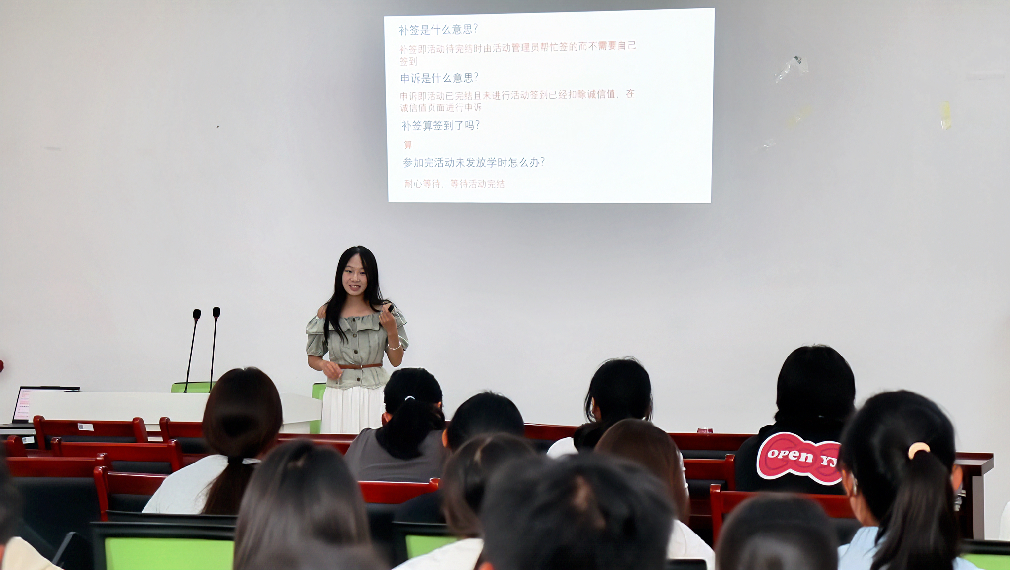 自由提问环节中,新生们跃跃欲试,迫切解决内心困惑。问题聚焦于“实验室方向选择对未来发展的影响”以及“如何详细与导师沟通”,学长学姐逐一对此进行了定点解答,用实际案例和个人建议消除新生面临选择的迷茫,为新生们提供个性化,精准化的成长指导。
