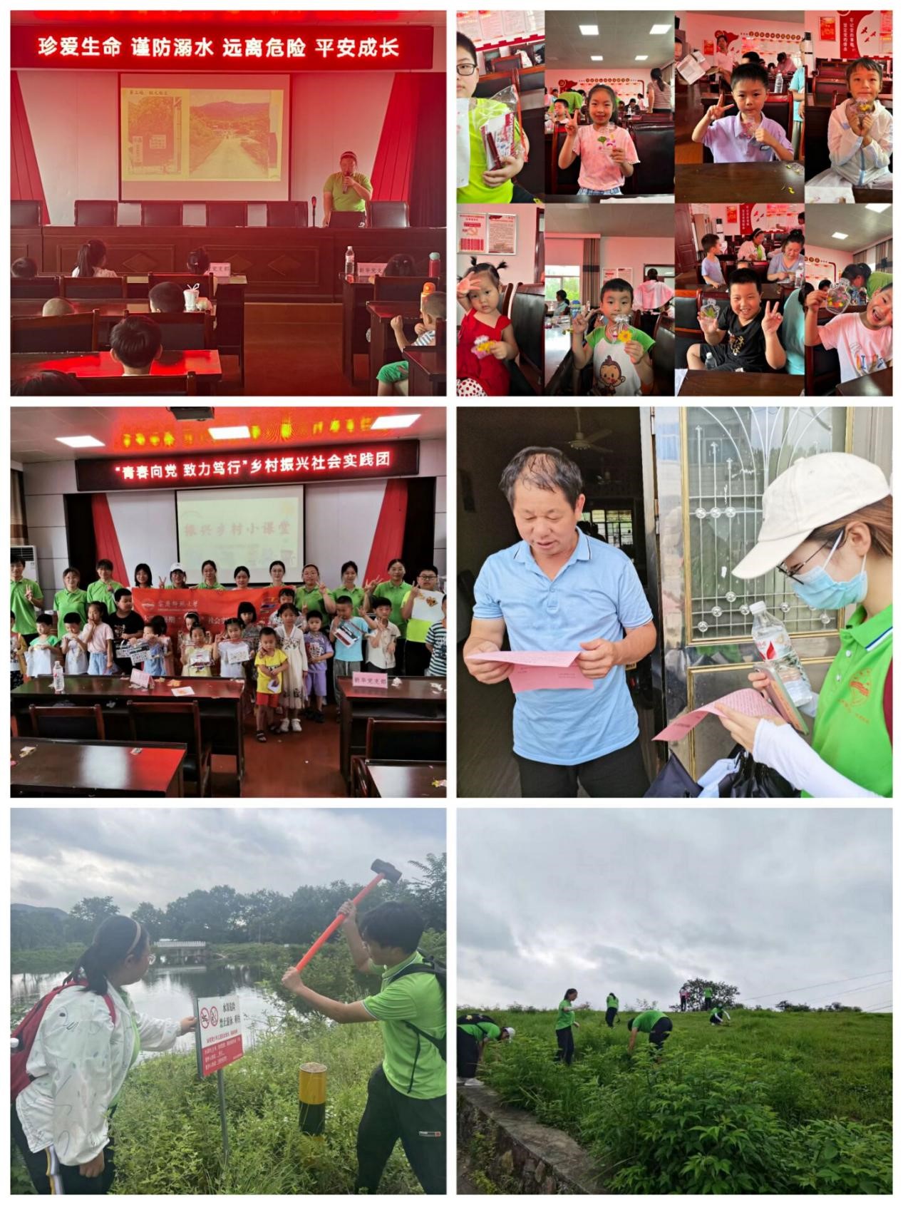紧接着团队成员们去居民家中进行养老防诈与防溺水宣传,并来到桃元社区水库,固定标语牌,进行除草劳动,增强服务意识,提升劳动能力。