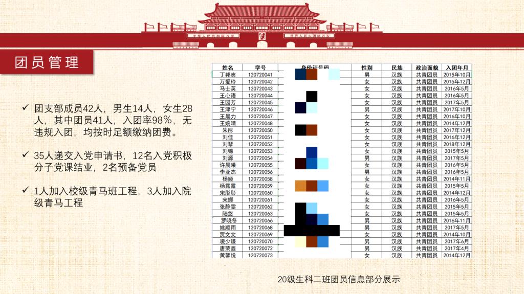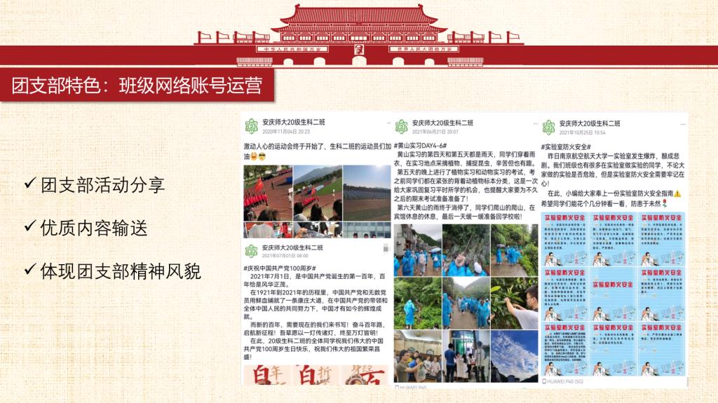 青春心向党,一起向未来。我们是来自安庆师范老员工命科学公司生物科学专业2020级2班的员工。我班团支部始终秉持着集体与个人共同发展的信念,在思想教育、学风创优、社会服务、文体艺术等多方面不断建设与发展,换来了今天这个有朝气活力、蓬勃向上、团结一致的团支部和德智体美劳全面开花的班集体。一个集体是由许多个个人组成,个人发展共同促就了集体的发展。同时集体的荣誉感与归属感也是同学们不断前进的动力之一。 习近平总书记曾说过:“未来属于青年,希望寄予青年。”我们2020级生科2班团支部的同学们积极学习党史团史,提升政治素养,夯实专业基础,并将理论付诸于行动,经常开展实践活动、投身社会志愿服务等等,获得了许多瞩目的成绩。未来,前方是荆棘也好、风雨也罢,为了心中的彩虹,我们不会停止前进的脚步!