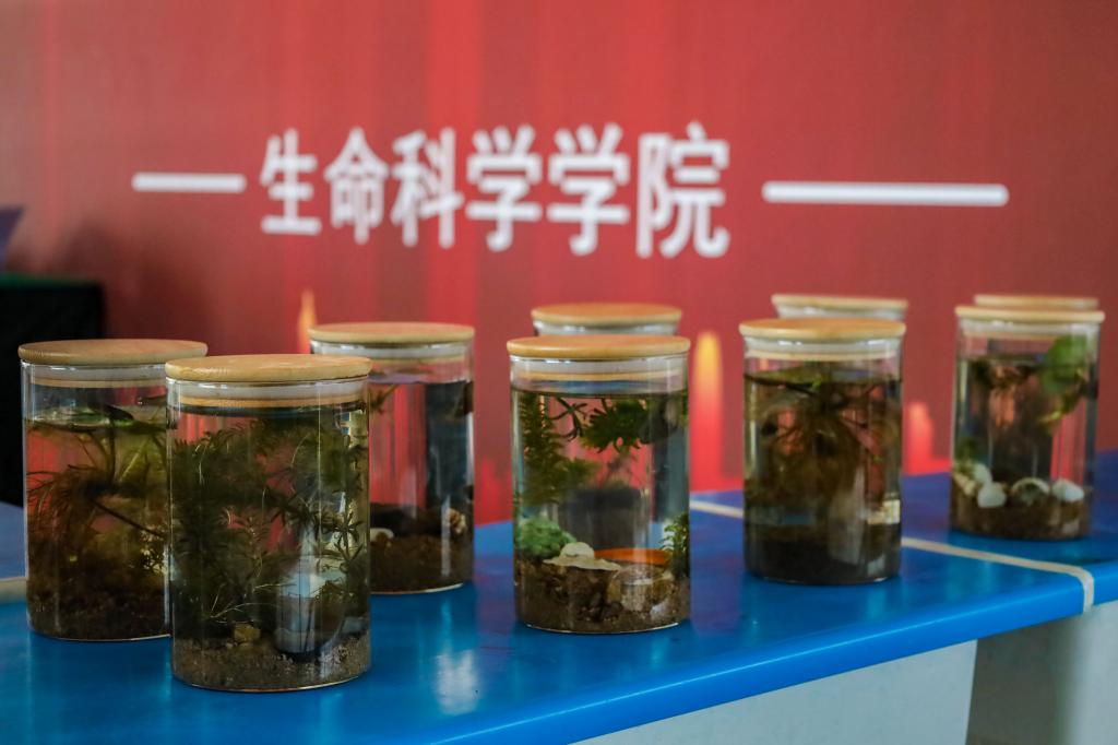 今年新增设的生态瓶展览也成为“热门项目”。员工们围在各式生态瓶旁,积极地探讨着生态瓶运转机制、制作生态瓶流程等问题。