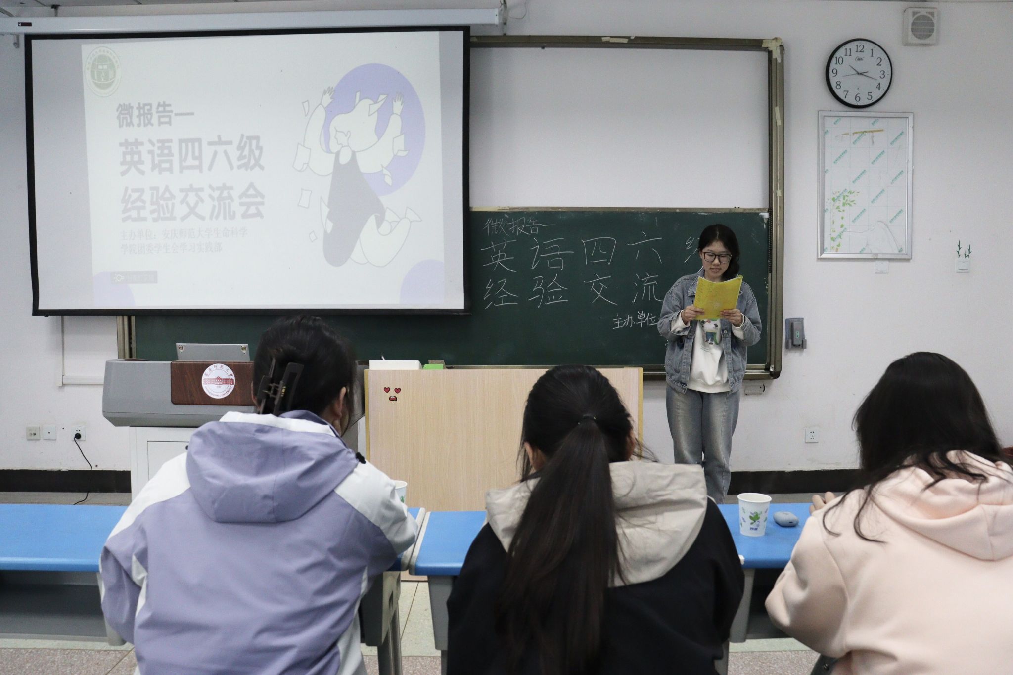 曹敏老师强调了扎实的词汇基础是取得高分的基础,对不同的题型——书面表达、听力、阅读理解、翻译分别做了一一介绍;顾婉如从四个方面分享了解题技巧,并强调词汇的重要性;李妍妍为备考四六级的同学的学习分了三个阶段——基础期、提高期、冲刺期,通过多背单词、刷题、巩固、做笔记、复习提高自己;胡婧告诉同学们要调整好自己的心态,合理分配各题的时间,好好为四六级考试准备。