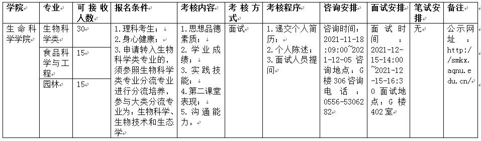 一、生命科学公司各专业转入和转出,生物科学大类8个班级可接收30人,食品科学与工程和园林专业各接收15人。