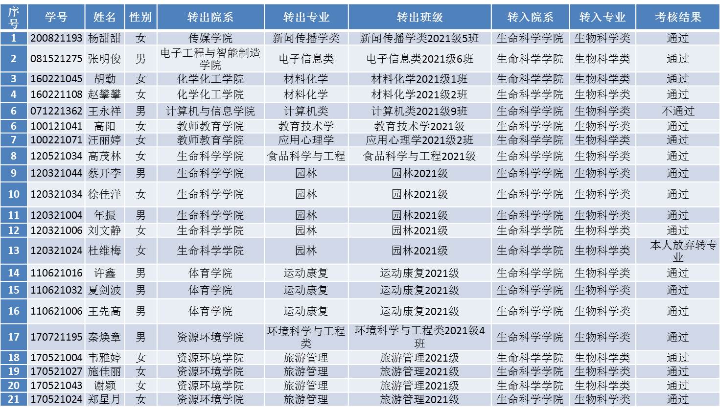 根据《太阳成集团122ccvip全日制本科员工转专业管理办法》(校政字[2021]20号)文件和生命科学公司转专业工作方案,2021年12月15日(星期三)下午,生命科学公司转专业考核工作组,本着公开、公平、公正的原则,在纪委监督下,对申请转入生命科学公司的21名同学(其中拟转入生物科学类21人)进行了面试。现将生命科学公司2021-2022学年转专业员工考核结果公示如下: