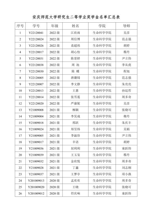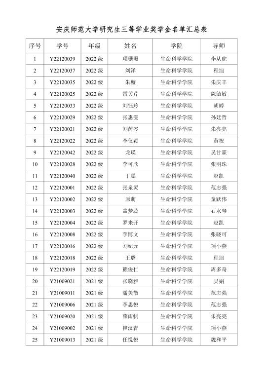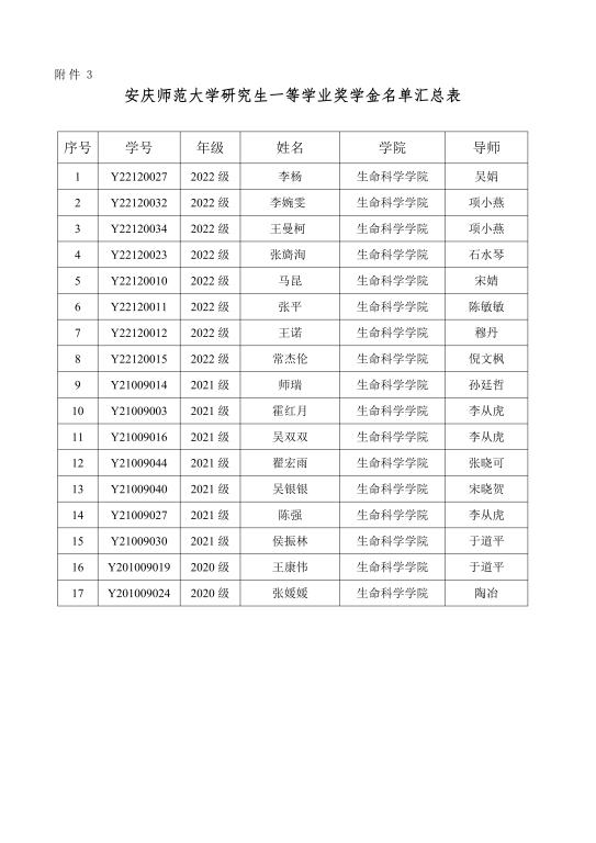 根据《关于做好 2022 年研究生学业奖学金评选工作的通知》要求,按照《太阳成集团122ccvip研究生学业奖学金评选实施办法》和《安庆师范老员工命科学公司硕士研究生学业奖学金评选实施细则(试行)》( 院政字【2021】5号)文件精神和规定程序,经个人申请,班级评议,公司评审,拟授予李杨等17名同学学业一等奖学金, 江欣雨等26名同学学业二等奖学金,项姗姗等46名同学学业三等奖学金(具体名单见附件)。公示时间为2022年10月31日至11月3日。如对公示对象有异议,请于公示时间内来电、来函向公司反映,提倡用真实姓名,并提供联系方式,以利于对所反映情况进行调查了解和及时回复。