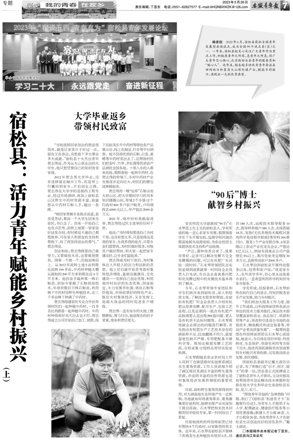 近日,安徽青年报专题报道了公司青年教师石水琴博士献智宿松乡村振兴的先进事迹(http://epaper.ahyouth.com/index.php?CurrPeid=2235&CurrSid=21338)。