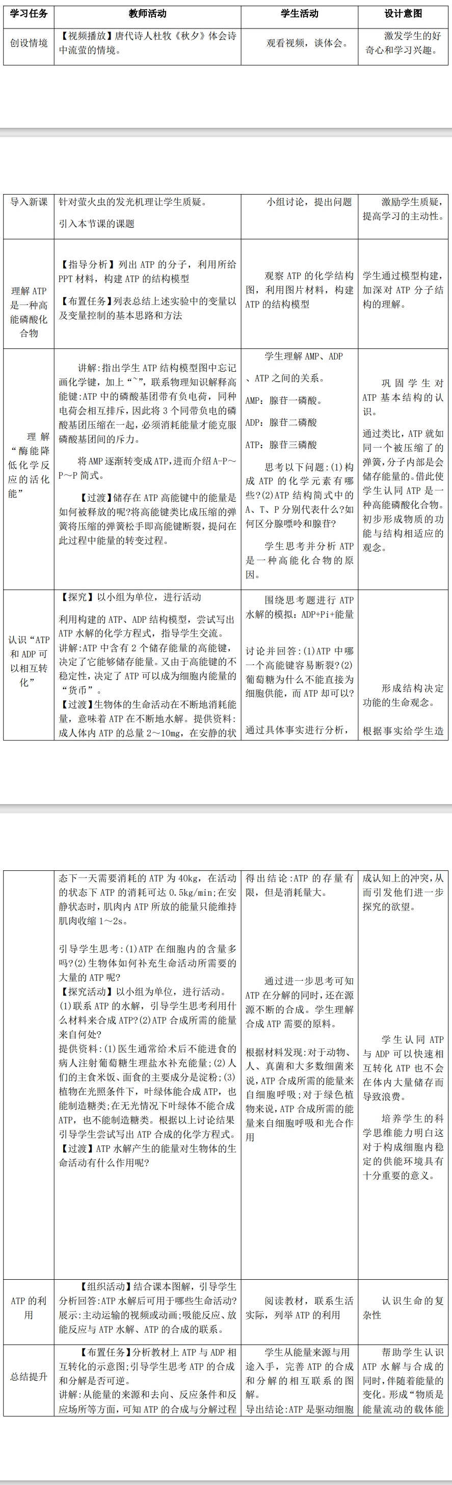 本节课设计采用探究分析教学模式,围绕“ATP的结构和功能”展开讨论与学习,初步建立生物学的物质和能量观。教学中为员工提供了相关内容的资料分析,员工在教师的指导下,通过感知、体验、实践、合作等方式,达成教学目标。