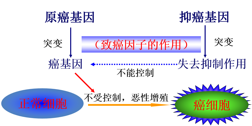 人和动物细胞中的DNA上本来就存在与癌变相关的基因:原癌基因和抑癌基因。一般来说,原癌基因表达的蛋白质是细胞正常的生长和增殖所必需的,这类基因一旦突变或过量表达而导致相应蛋白质活性过强,就可能引起细胞癌变。相反,抑癌基因表达的蛋白质能抑制细胞的生长和增殖,或者促进细胞凋亡,这类基因一旦突变而导致相应蛋白质活性减弱或失去活性,也可能引起细胞癌变。