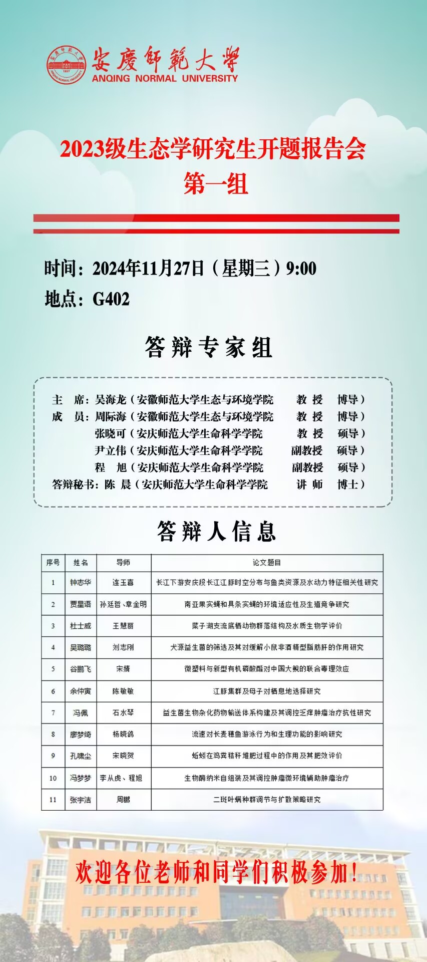 生命科学公司2023级硕士研究生学位论文开题答辩安排