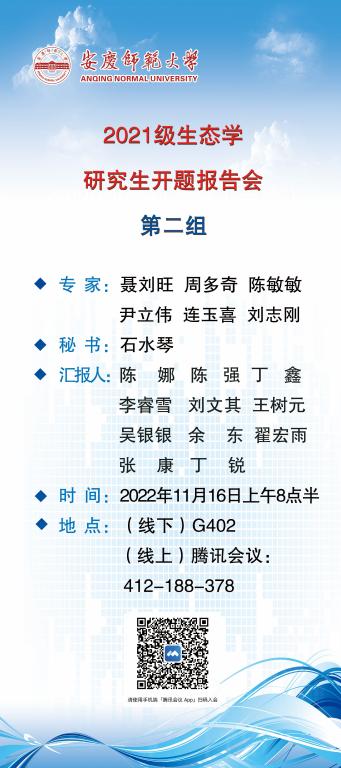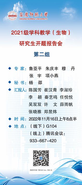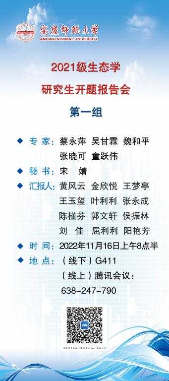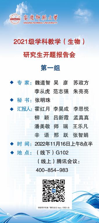 拟定于2022年11月16日上午八点半进行安庆师范老员工命科学公司2021级生态学及学科教学(生物)专业开题报告会,报告会形式采用线上线下结合方式进行。