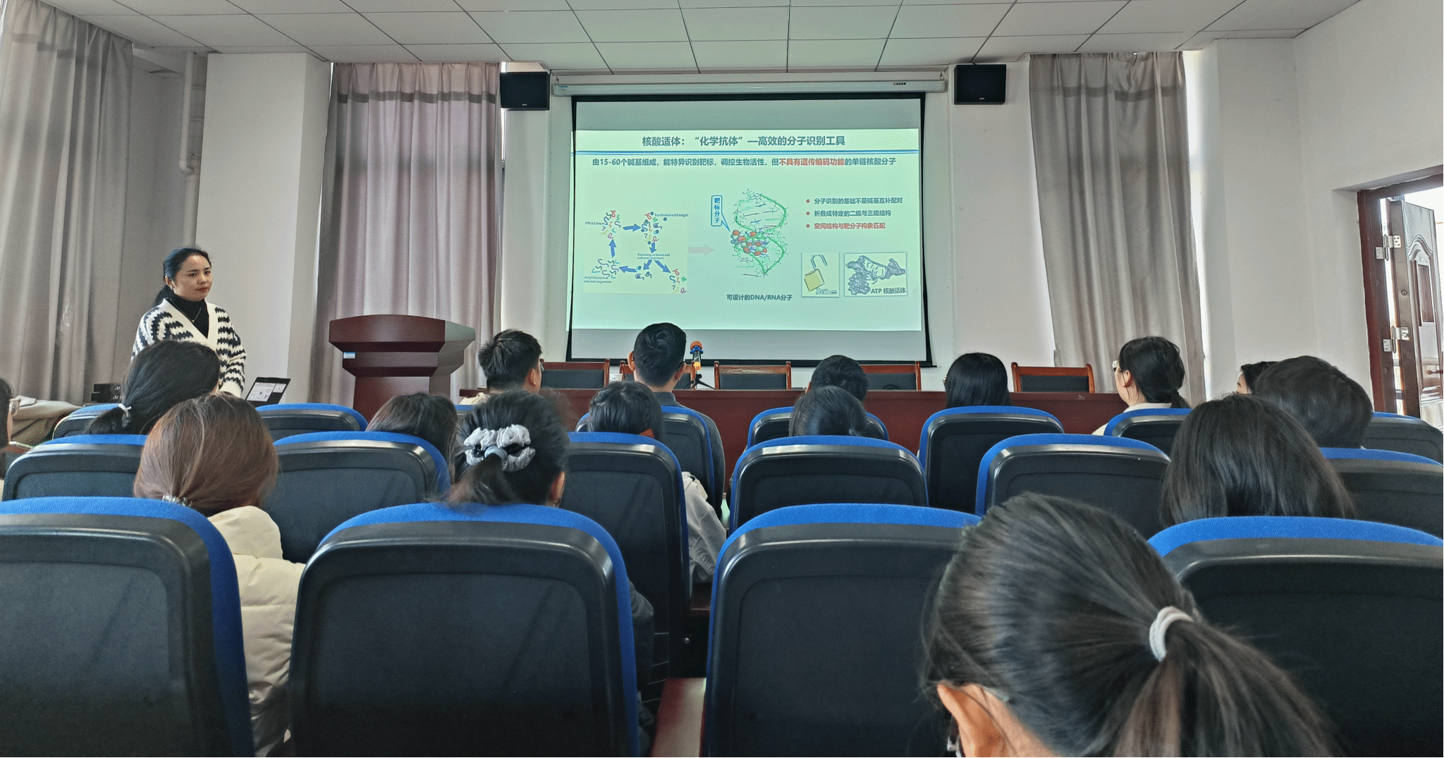 张慧副研究员介绍了核酸适体的概念及优势:高亲和力、高特异性、低毒性,可用于各种检测和治疗;分享了核酸适体相关研究,并详细介绍了核酸适体的靶向蛋白降解相关研究工作。报告结束后,她与现场师生展开了互动交流。