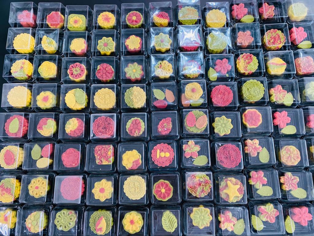 活动主要分为制作茶糕品味传统文化和献上茶糕感念教师恩情两部分。活动前几日,同学们就开始了此次活动的准备工作,蒸熟去皮绿豆碾压成粉,按比例掺入研磨过的茶粉,配比制作,反复调制和试验。当日,生科院全体研究生齐聚一堂,分为蒸豆组、磨粉组、调味组、炒制组和倒模组,大家各司其职,热火朝天,其乐融融!实验室里充满了大家的欢声笑语,最终制成了近百来份颜色和形态各异的茶点,每一份都充分融入了同学们的想象力,形态与颜色的糅合与碰撞迸发出充满新意的作品。庆祝建党百年的相关元素,如“数字100”、“五角星图案”等等成为重要主题。
