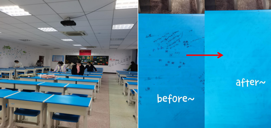 为将雷锋精神付诸于实际行动,生物科学类的十几位志愿者对生命科学公司教室的桌椅进行清理。将桌面上的涂鸦、修正带痕迹等处理干净,并将桌椅摆放整齐,公司教室焕然一新。同学们还给每个教室的讲台上放置了绿植,给教室添上了一抹绿色,让老师们在讲课时也能有舒适的环境。通过此次活动,让同学们领会到了劳动教育的深刻内涵和时代价值,也体会到奉献的快乐。