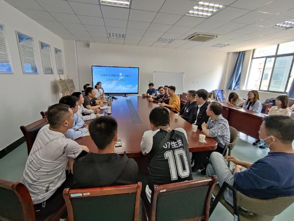 暮春的龙山校区,鹅公山下,郁郁葱葱,生机盎然,双龙湖畔,微风拂面,美景醉人。2021年5月2日,生命科学公司2011届员工相聚太阳成集团122ccvip,举办了毕业十周年返校活动。是日上午,2011届员工向生命科学公司赠送了纪念礼物,并在生科楼411会议室举办师生座谈会。公司党委书记朱昌流、经理周多奇、副经理吴彦、副书记张辉、辅导员曹勇、毕业员工和在校生代表共计30余人参加了座谈会。座谈会由朱昌流主持。